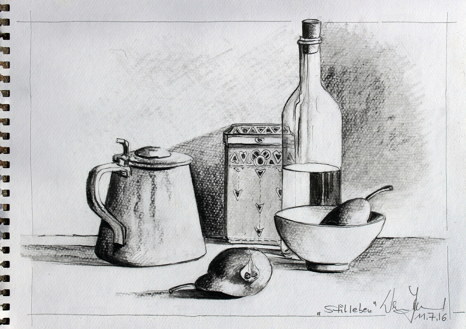 In diesem Online-Kunstkurs wird beschrieben wie man Stillleben zeichnen und malen kann. Stilleben arrangieren fotografieren und zeichnen Ein Beitrag von Axel Schliwa Stillleben werden gern kompliziert arrangiert schlecht vor ungeeigneten Hintergründen ausgeleuchtet und sind oft von der Idee dass ein Gegenstand immer als Ganzes abgebildet werden. Das Volumen der Kanne wird durch zusätzliche halbkreisförmige Linien überschritten.