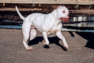 Glucklicher Weisser Pitbull Hund Mit Der Keuchenzunge Stockbild Bild Von Schutz Bedingung 144428589