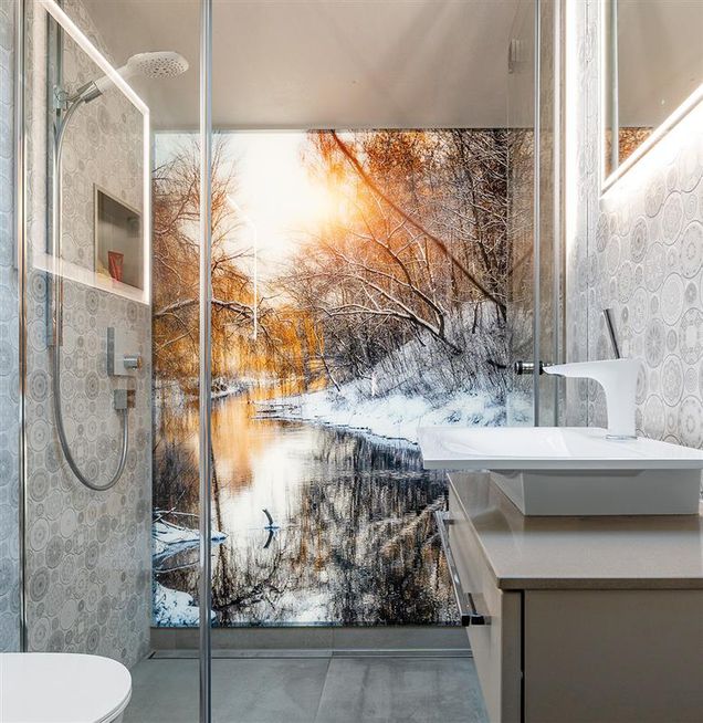 Bilder im Bad sollen nicht direkt neben einer ebenerdigen Dusche oder Badewanne aufgehängt werden denn Dampf und Wasserspritzen sind genau in diesem Bereich konzentriert. Wandbilder sind eine einfache Art bestimmte Stimmungen in das Zimmer zu zaubern. Fliesen Wand und Decke sorgen für bunte Farben im Bad.